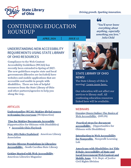 Read the newsletter<https://dam.assets.ohio.gov/image/upload/v1776792788/library.ohio.gov/LPD/CE%20Roundup/CE_Roundup_April_2026.pdf> (PDF)