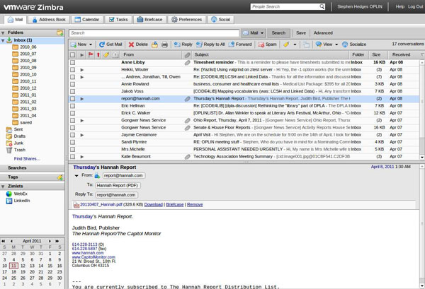 Besides the new look and features of Zimbra, nothing major will change. You will still have the same OPLIN email address as well as all of your old email and contacts. Also, we will be increasing your webmail storage space from 100 MB to 1 GB. Additional help information for Zimbra will be available on the OPLIN website next week. For those interested in a comparison, screenshots of both SquirrelMail (old) and Zimbra (new) applications are attached.