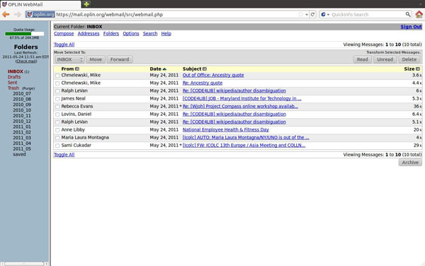 Next week, OPLIN will be changing to a new web-based mail application called Zimbra. We have set a release date of June 1 for migrating to Zimbra, which means that May 31 will be the last day to see the old webmail (SquirrelMail) interface. This change will only affect those users who are currently using webmail (mail.oplin.org) to login through their browsers, not those using separate email clients.